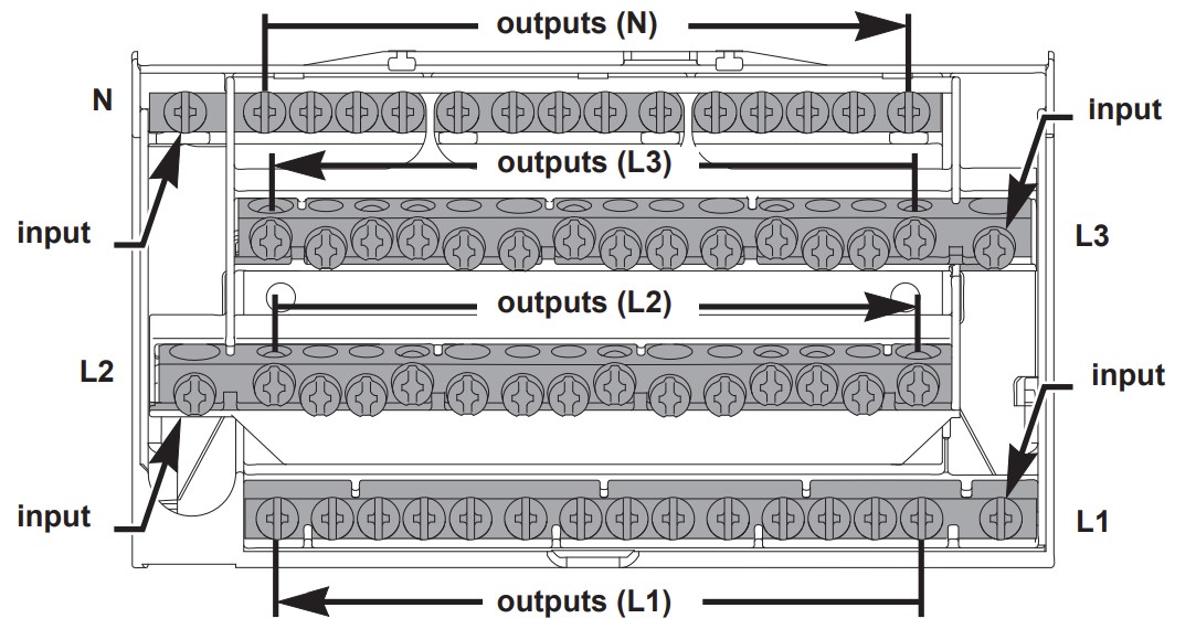 Vijčani distribucijski blok 4P 125A s 48 rupa za priključke, za montažu na DIN šinu