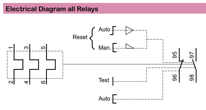 – ako struja premaši zadanu postavku, pomoćni kontakti releja će promijeniti stanje, te na taj način dolazi do zaustavljanja motora