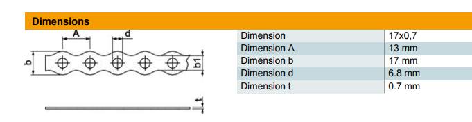 Dimenzije: duljina – 10 m, širina – 17 mm, debljina – 0,7 mm, promjer rupe – Ø 6,8 mm